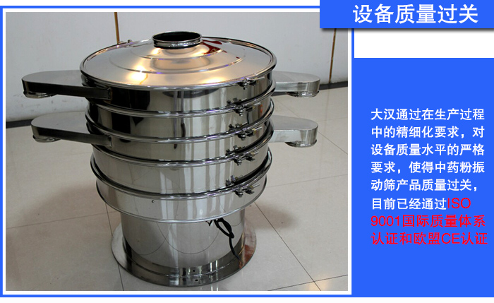 新鄉(xiāng)大漢創(chuàng)立20多年以來(lái)始終堅(jiān)信:只有過(guò)硬的產(chǎn)品質(zhì)量才能讓企業(yè)贏得市場(chǎng),只有過(guò)硬的產(chǎn)品質(zhì)量才能讓企業(yè)獲得更好的效益,也只有過(guò)硬的產(chǎn)品質(zhì)量才能實(shí)現(xiàn)企業(yè)的可持續(xù)發(fā)展。大漢通過(guò)在生產(chǎn)過(guò)程中的精細(xì)化要求,對(duì)設(shè)備質(zhì)量水平的嚴(yán)格要求,使得中藥粉振動(dòng)篩產(chǎn)品質(zhì)量過(guò)關(guān),目前已經(jīng)通過(guò)ISO9001國(guó)際質(zhì)量體系認(rèn)證和歐盟CE認(rèn)證。