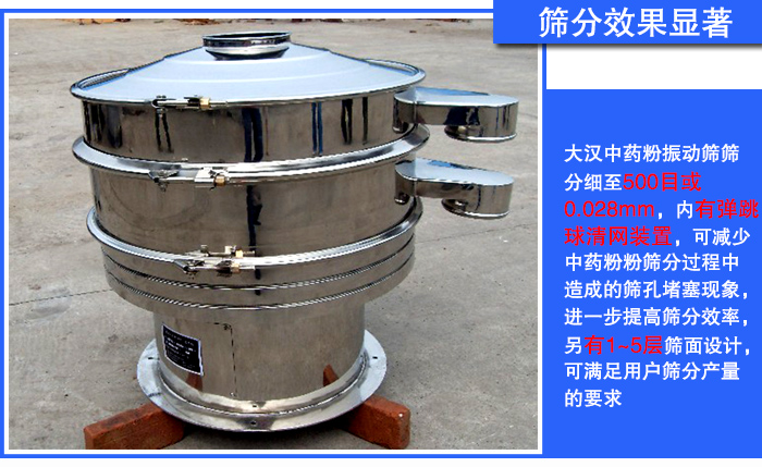 用于中藥粉篩分的設(shè)備,對(duì)其篩分精度要求是非常高的,需要達(dá)到好的篩分效果,大漢中藥粉振動(dòng)篩篩分細(xì)至500目或0.028mm,內(nèi)有彈跳球清網(wǎng)裝置,可減少中藥粉粉篩分過(guò)程中造成的篩孔堵塞現(xiàn)象,進(jìn)一步提高篩分效率,另有1~5層篩面設(shè)計(jì),可滿足用戶篩分產(chǎn)量的要求。