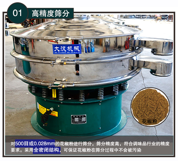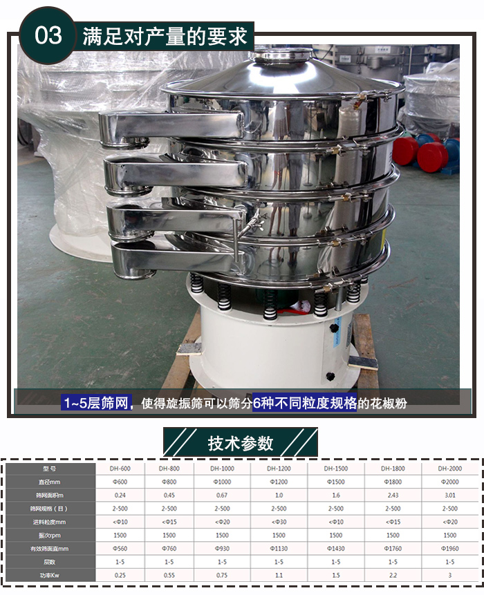 旋振篩特有的1~5層篩網(wǎng),使得旋振篩可以篩分6種不同粒度規(guī)格的花椒粉,產(chǎn)量大,還可滿足更多產(chǎn)量的要求。