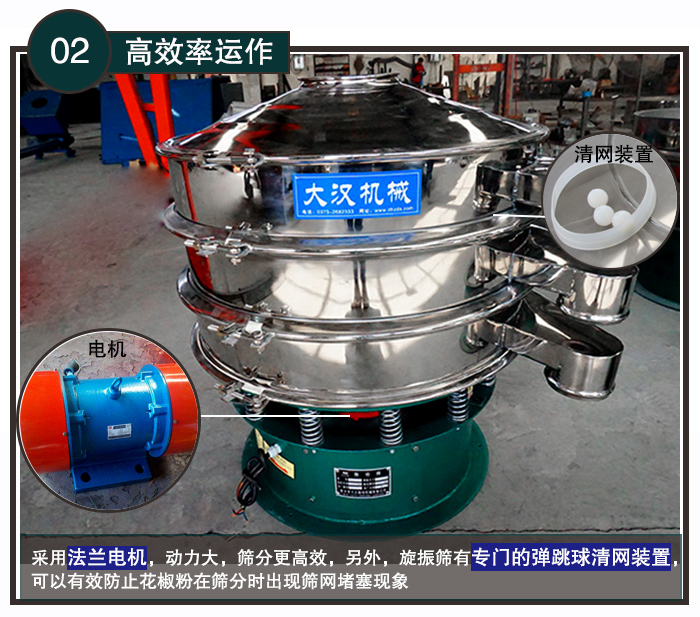 旋振篩采用法蘭電機(jī),動力大,篩分更高效,另外,旋振篩有專門的彈跳球清網(wǎng)裝置,可以有效防止花椒粉在篩分時(shí)出現(xiàn)篩網(wǎng)堵塞現(xiàn)象的發(fā)生,提高篩分效率。