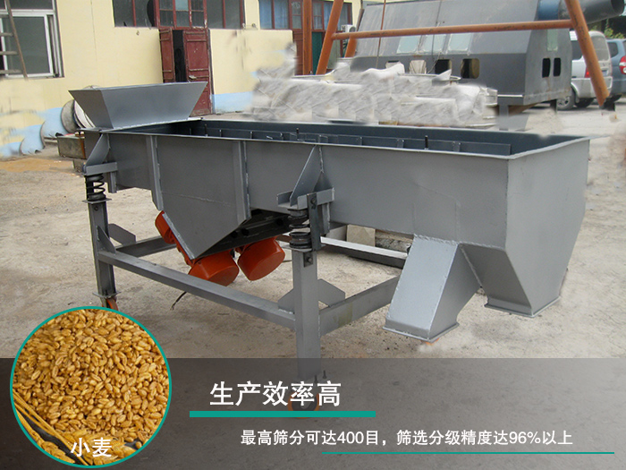 直線振動篩高篩分可達400目,篩選分級精度達96%以上,密封性能好,所以在篩分小麥時無粉塵溢散,篩分效率高。
