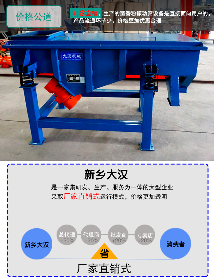 新鄉(xiāng)大漢茴香粉振動篩廠家直銷,生產(chǎn)的茴香粉振動篩設(shè)備是直接面向用戶的,產(chǎn)品流通環(huán)節(jié)少,價格更加優(yōu)惠合理。