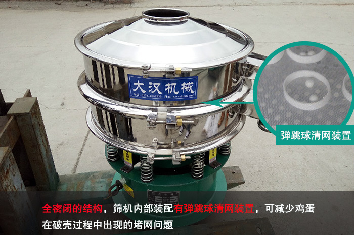 不銹鋼振動(dòng)篩采用了全密閉的結(jié)構(gòu),篩機(jī)內(nèi)部裝配有彈跳球清網(wǎng)裝置,可以在篩機(jī)工作時(shí)對(duì)篩面進(jìn)行清潔處理,減少雞蛋在破殼過程中出現(xiàn)的堵網(wǎng)問題,進(jìn)一步提高其篩分效率。