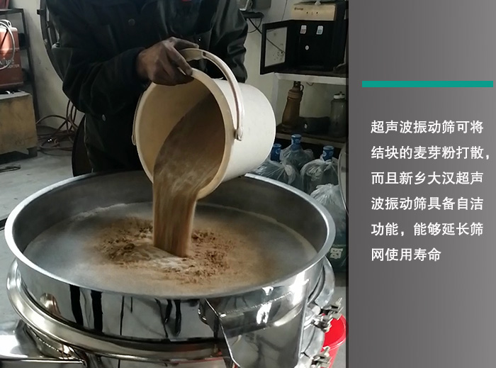 如果使用普通振動篩,麥芽粉在篩分中容易出現(xiàn)結塊、漏料的情況,而使用超聲波振動篩能夠很好的避免這一現(xiàn)象的發(fā)生,它通過超聲波換能器將電能轉換為波能傳遞到篩面上,可將結塊的麥芽粉打散,而且新鄉(xiāng)大漢超聲波振動篩具備自潔功能,能夠延長篩網(wǎng)使用壽命。