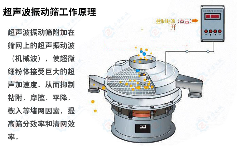 超聲波振動篩是在旋振篩產(chǎn)品的基礎(chǔ)上設(shè)計增加了一套超聲波裝置(即超聲波電源,超聲波換能器),可將各種常用的低頻電能轉(zhuǎn)化為高達(dá)38KHz的高頻電能,再通過超聲換能器,終得到一個38KHz機(jī)械振動,可以高效解決篩網(wǎng)堵塞風(fēng)險,提高篩分效率。
