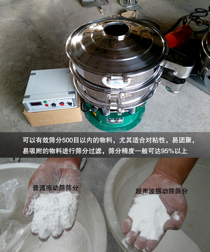 普通振動篩主要篩分的是300目以下的物料,而超聲波振動篩是在其基礎(chǔ)上加裝了超聲波篩分系統(tǒng),可以有效篩分500目以內(nèi)的物料,尤其適合對粘性,易團(tuán)聚,易吸附的物料進(jìn)行篩分過濾,普通振動篩的篩分精度一般60%~70%左右,而超聲波振動篩的篩分精度一般可達(dá)95%以上篩分精度高。