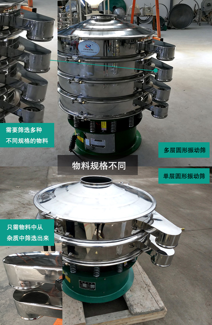 多層圓形振動篩是指多層,多個出料口的振動篩,如果用戶需要篩選多種不同規(guī)格的物料,就需要使用我們的多層圓形振動篩,例如:用戶型要篩選3種不同粒度規(guī)格的物料,就可以選擇2層圓形振動篩。
