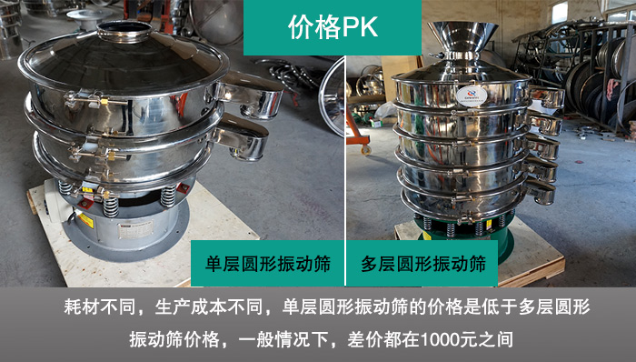 單層圓形振動篩相對多層圓形振動篩而言,其耗材更少,廠家的設計和生產成本也會相對更低,所以普遍來首,單層圓形振動篩的價格是低于多層圓形振動篩價格的,一般情況下,差價都在1000元之間。