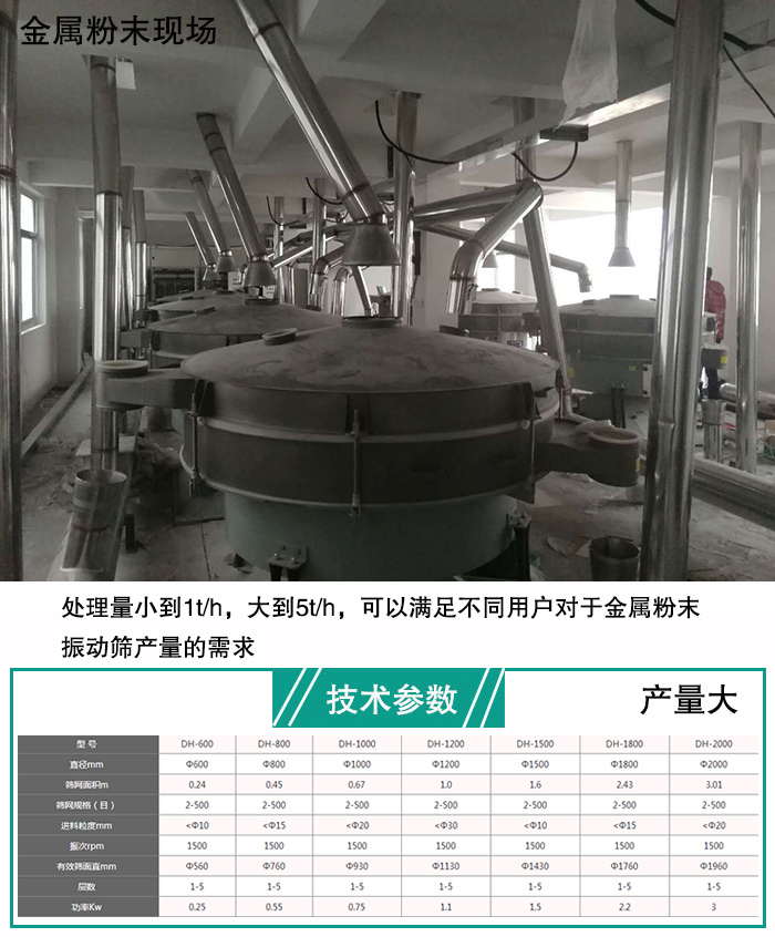 新鄉(xiāng)大漢金屬粉末振動處理量小到1t/h,大到5t/h,可以滿足不同用戶對于金屬粉末振動篩產(chǎn)量的需求。