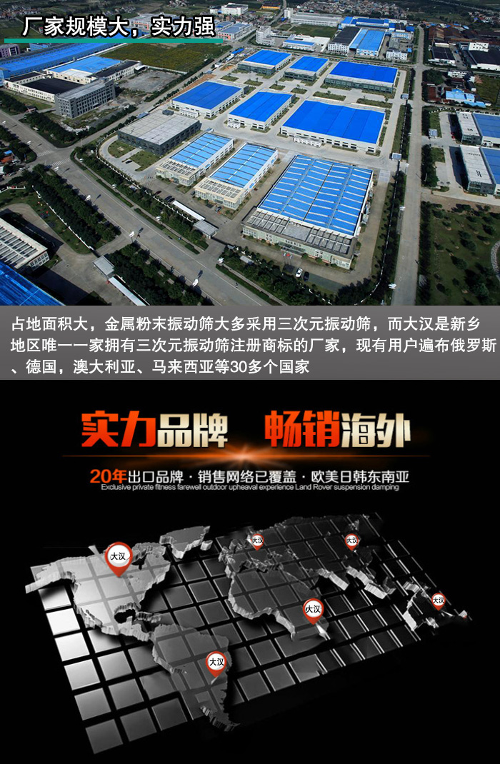 新鄉(xiāng)大漢占地10000平方米,擁有自己獨立的大型工業(yè)廠房,各種設(shè)備齊全,而且新鄉(xiāng)大漢生產(chǎn)振動篩30余年,積累了大量的生產(chǎn)經(jīng)驗。金屬粉末振動篩大多采用三次元振動篩,而大漢是新鄉(xiāng)擁有三次元振動篩注冊商標的廠家,專業(yè)性非常強,現(xiàn)有用戶遍布俄羅斯、德國,澳大利亞、馬來西亞等30多個國家,用戶口碑好。