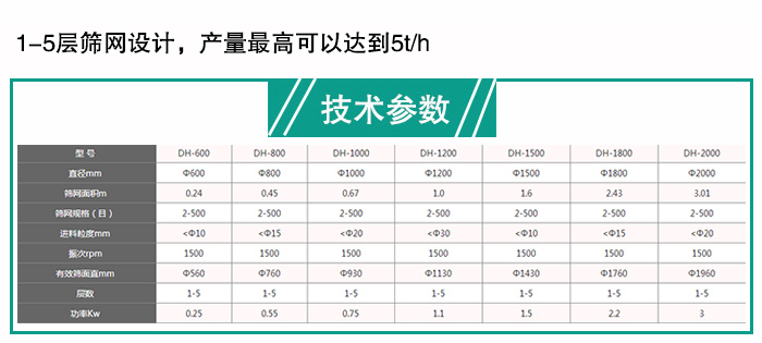 大漢生產(chǎn)的旋振篩型號(hào)包括DH-600,DH-800,DH-1000,DH-1200,DH-1500,DH-1800,DH-2000等,1-5層篩網(wǎng)設(shè)計(jì),產(chǎn)量高可以達(dá)到5t/h,滿(mǎn)足石英粉時(shí)產(chǎn)5噸的要求。