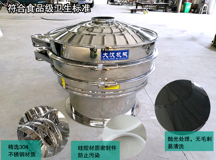 蛋糕粉終用于食品行業(yè),所以在選擇振動篩設(shè)備是還要考慮其衛(wèi)生情況,大漢不銹剛振動篩采用304不銹鋼材質(zhì),進過嚴格的拋光處理,再加上其采用硅膠材質(zhì)的密封件,防止蛋糕粉在篩分過程中被外界環(huán)境所污染,完全符合食品衛(wèi)生標準,用戶可以放心使用。