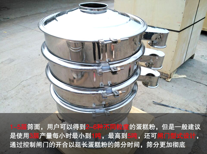 不銹鋼振動篩篩面層數(shù)有1~5層,用戶可以得到2~6種不同粒度的蛋糕粉,但是一般建議是使用3層,產(chǎn)量每小時小到1噸,高到5噸,另外,為了更好地對蛋糕粉進行篩分,大漢廠家還設(shè)計了閘門型旋振篩,用戶可以一次投料長久篩分作業(yè),通過控制閘門的開合以達到良好篩分的目的,篩分效率高。