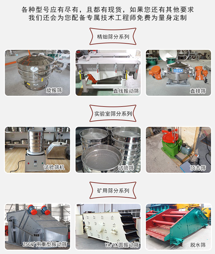 大漢廠家生產(chǎn)的振動(dòng)篩主要針對(duì)精細(xì)篩分,實(shí)驗(yàn)室篩分,礦用篩分等多種不同的場(chǎng)景,該設(shè)備種類型號(hào)多樣,有幾百種型號(hào)可供您選擇,且都有現(xiàn)貨,如果您還有其他要求,我們還會(huì)為您配備專屬技術(shù)工程師免費(fèi)為量身定制。