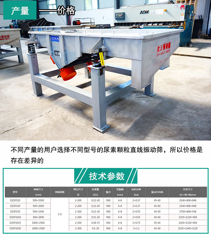 如果用戶對于塑料顆粒的產(chǎn)量要求少,可以選擇小型號振動篩,如:DZSF-515、DZSF-520等,產(chǎn)量一般的就可以選擇中等型號的振動篩如:DZSF-525等,而對于大產(chǎn)量用戶來首,就需要選擇大型號振動篩 如:DZSF-1020、DZSF-1025、DZSF-1030等,不同產(chǎn)量的用戶選擇不同型號的尿素顆粒直線振動篩,所以價格是存在差異的。具體型號參數(shù)如下表所示:
