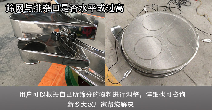 解決方案:通常情況下,超聲波振動(dòng)篩篩網(wǎng)應(yīng)比排雜口高出5mm,不同的物料,出料口高度設(shè)計(jì)不一樣,用戶可以根據(jù)自己所篩分的物料進(jìn)行調(diào)整,詳細(xì)可咨詢新鄉(xiāng)大漢廠家?guī)湍鉀Q。