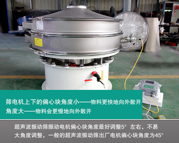 改善出料慢還可以通過(guò)調(diào)整超聲波振動(dòng)篩電機(jī)上下偏心塊角度實(shí)現(xiàn)。如果超聲波振動(dòng)篩電機(jī)上下的偏心塊角度小,會(huì)使篩面上的物料更快地向外散開(kāi),角度變大的話,則物料會(huì)更慢地向外散開(kāi)。