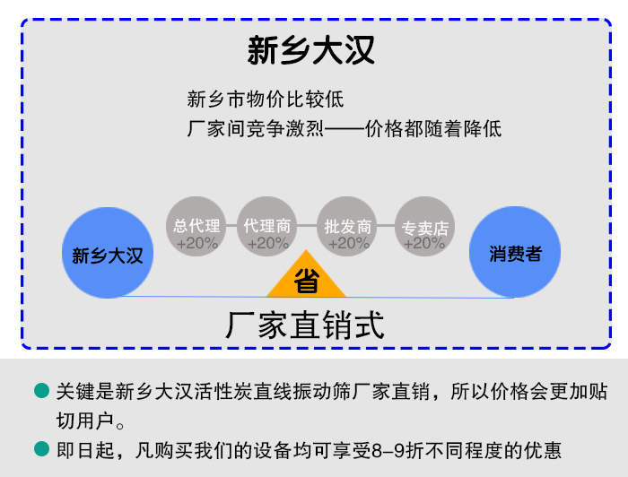 大漢廠家位于新鄉(xiāng)市,物價比較低,人均消費水平也不算高,所以活性炭直線振動篩銷售價格自然也會有所降低,活性炭直線振動篩廠家比較多,廠家間競爭激烈,導致河南市場上很多的廠家會以低價銷售設備,提高設備銷量,這樣整體的價格都隨著降低。再加上,新鄉(xiāng)大漢活性炭直線振動篩廠家直銷,所以價格會更加貼切用戶。而且大漢廠家為回饋新老用戶,即日起,凡購買我們的設備均可享受8-9折不同程度的優(yōu)惠。
