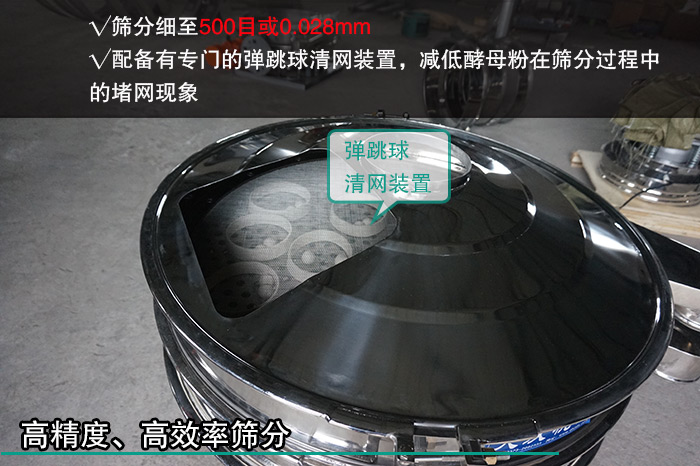 酵母粉屬于食品行業(yè)的一種調(diào)味劑,所以在篩分酵母粉時(shí)對(duì)其篩分精度要求是很嚴(yán)格的,而三次元振動(dòng)篩作為一種高精度細(xì)粉篩分設(shè)備,篩分細(xì)至500目或0.028mm,另外三次元振動(dòng)篩配備有專門的彈跳球清網(wǎng)裝置,減低酵母粉在篩分過(guò)程中的堵網(wǎng)現(xiàn)象,提高篩分精度和篩分效率。