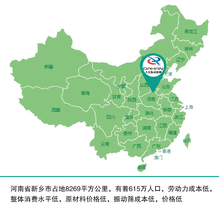 河南省新鄉(xiāng)市占地8269平方公里,有著615萬(wàn)人口,人口眾多,決定了其勞動(dòng)力成本低,整體消費(fèi)水平低,原材料價(jià)格低,因此決定了振動(dòng)篩成本低,價(jià)格低。
