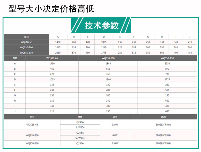 大漢臥式氣流篩型號(hào)包括WQS18-65型、WQS30-100型、WQS50-130型,每種型號(hào)之間的臥式氣流篩對(duì)應(yīng)的電機(jī)功率是不一樣的,所以參數(shù)配置方面也有所不同,這對(duì)臥式氣流篩價(jià)格會(huì)造成一定的影響。