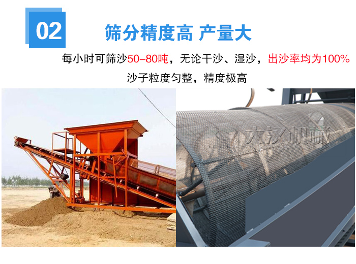 滾筒篩篩沙機(jī)通過自身旋轉(zhuǎn)滾動,將沙子和其雜質(zhì)從高處自由落體運(yùn)動到底部,透過篩網(wǎng),完成篩分,每小時可篩沙50-80噸,無論干沙、濕沙,出沙率均為100%,產(chǎn)量大且沙石分離效果好,所得沙子粒度勻整。
