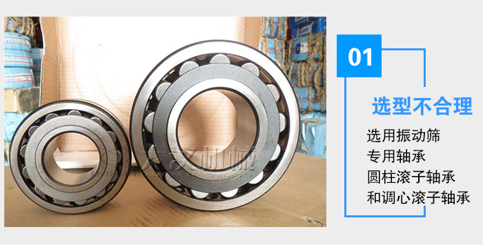 解決方法:選用振動篩專用軸承,常用的振動篩軸承一般有圓柱滾子軸承和調(diào)心滾子軸承,圓柱滾子軸承可以承受較高的極限轉(zhuǎn)速,對動靜載荷的承載能力強(qiáng),但對軸承座孔的同軸度要求較高,調(diào)心滾子軸承調(diào)心性能好,能補(bǔ)償因軸承座孔加工造成的不同軸問題,但不能承受純軸向載荷。