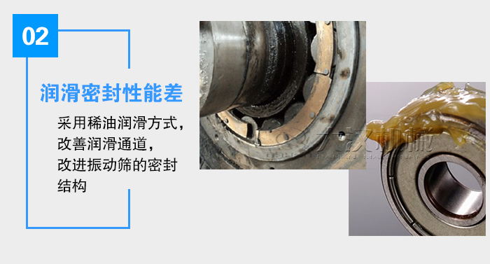 解決方法:采用稀油潤滑方式,改善潤滑通道,改進(jìn)振動篩的密封結(jié)構(gòu),當(dāng)前不少振動篩廠家采用稀油循環(huán)潤滑,迷宮密封與其他非接觸性密封結(jié)合的結(jié)構(gòu)。