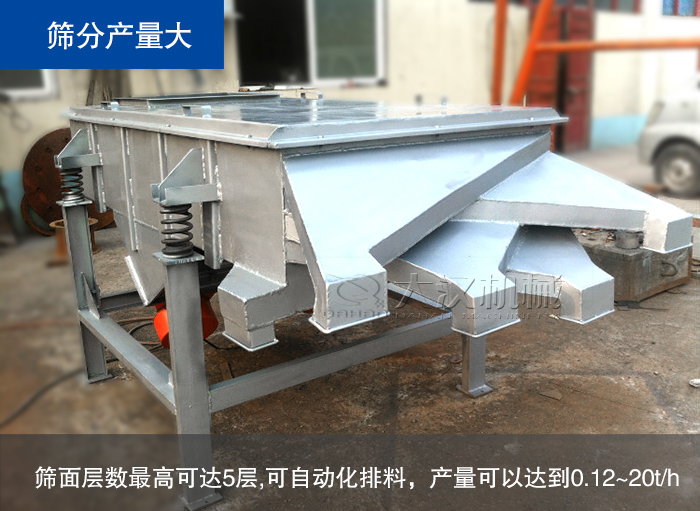 直線振動(dòng)篩篩面層數(shù)高可達(dá)5層,用戶可以根據(jù)篩分產(chǎn)量的大小選擇合適層數(shù)的直線振動(dòng)篩。另外,耐火材料直線振動(dòng)篩可以自動(dòng)化排料,產(chǎn)量可以達(dá)到0.12~20t/h。