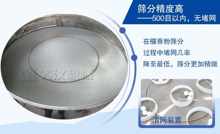 旋振篩適用物料范圍廣,篩分精度高,可以篩分500目或0.028mm,還另外配備有清網(wǎng)裝置(彈跳球),在檀香粉篩分過程中堵網(wǎng)幾率降至低,篩分更加精細(xì)。