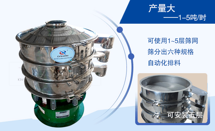 旋振篩可使用1~5層篩網(wǎng),網(wǎng)架經(jīng)過特殊設(shè)計(jì),高可以安裝五層,能篩分出六種規(guī)格不同的物料,可以實(shí)現(xiàn)自動(dòng)化排料,篩分產(chǎn)量范圍在1-5噸/時(shí)之間,篩分效果好。