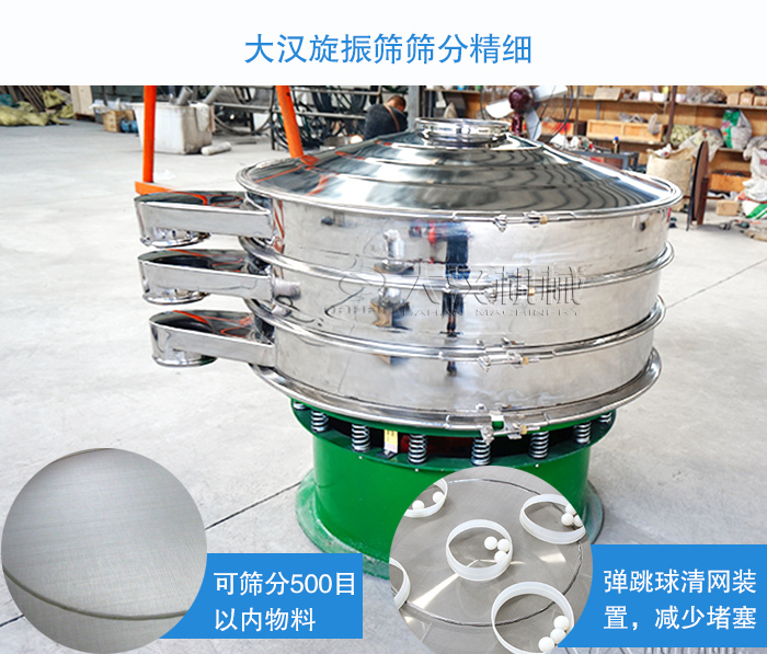 80目—200目的珍珠巖粒度較小,使用直線振動篩無法滿足精度上的要求,這時候應(yīng)該采用旋振篩設(shè)備,大漢旋振篩篩分精細(xì),可以篩分500目以內(nèi)的粉狀及顆粒狀物料,另外加裝彈跳球清網(wǎng)裝置,可減少篩孔堵塞的問題,提高篩分精度。不過,根據(jù)珍珠巖的容重不一樣,同樣型號的旋振篩能達(dá)到的產(chǎn)量也不一樣,一般處理量在0.2t/h--5t/h。