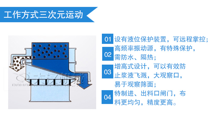 陶瓷行業(yè)行業(yè)的一些顏料(如:陶瓷釉料)需要使用漿液振動(dòng)篩,是專門針對(duì)液體過濾的一種單層振動(dòng)篩,適合于處理生產(chǎn)量不多或雜質(zhì)少,流動(dòng)性好的物料。采用新型立式振動(dòng)電機(jī)為振動(dòng)源,立式振動(dòng)電機(jī)上、下兩端裝有偏心重錘,可產(chǎn)生水平、垂直、傾斜的三次元運(yùn)動(dòng),然后將運(yùn)動(dòng)傳遞到篩分表面達(dá)到優(yōu)良分級(jí)。通過調(diào)節(jié)上、下偏心重錘的相位角,可改變物料在篩面上的運(yùn)動(dòng)軌跡,保證物料充分分級(jí)。