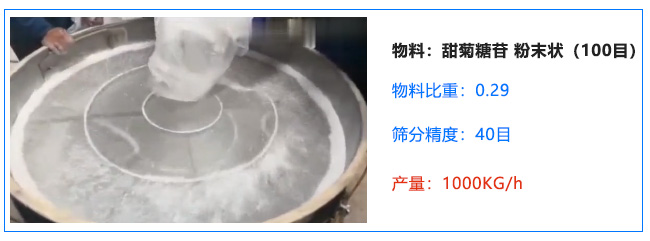 客戶一:物料是甜菊糖苷 粉末狀 物料本身100目左右 物料比重0.29 篩分精度40目 處理量1000KG/h。需要旋振篩。