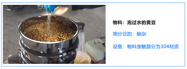 客戶三:要一臺旋振篩與物料接觸部分要304材質(zhì),用于篩泡過水的黃豆,除雜用,把黃豆里面的小石子和細(xì)沙過濾掉