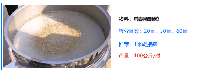 客戶六:自用 篩胡椒顆粒 選的1米旋振篩 機(jī)裝20目,30目,60目 物料流動性好 一個(gè)小時(shí)100公斤 20目以上的占5成,60目以下的占3成