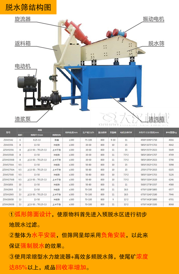 脫水篩篩面多為向上爬坡,有利于尾礦干排,而一般的振動篩是水平或者向下的篩面,更利于出料。脫水篩入料段采用獨(dú)特的弧形篩面設(shè)計(jì),使原物料首先進(jìn)入預(yù)脫水區(qū)進(jìn)行初步地脫水過濾,從而大大地提高了脫水效率,然后篩機(jī)部分的整體為水平安裝,但篩網(wǎng)呈卻采用負(fù)角安裝,以此來保證強(qiáng)制脫水的效果。經(jīng)過一步步地脫水過濾,篩分出來的產(chǎn)品更加精細(xì),而且篩機(jī)的處理量高達(dá)70-100t/h,另外,使用濃縮型水力旋流器+高效多頻脫水篩,可以使尾礦終濃度達(dá)85%以上,使成品回收率增加,解決了傳統(tǒng)尾礦排放尾砂造成的環(huán)境污染。