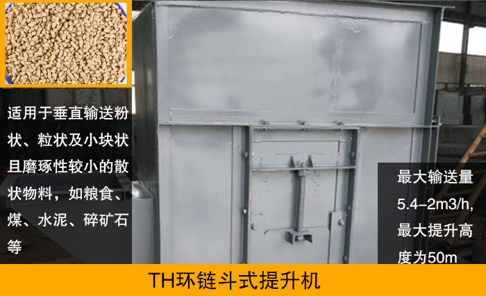 TH系列斗式提升機(jī)是一種常用的提升設(shè)備,其主要由由運(yùn)動(dòng)部分(料斗與牽引鏈條)、帶有傳動(dòng)鏈輪的上部區(qū)段、帶有拉緊輪的下部區(qū)段、中間機(jī)殼、驅(qū)動(dòng)裝置、逆止制動(dòng)裝置等組成,該種類的斗式提升機(jī)采用混合式或重力卸料,挖取式裝料。TH型區(qū)別于TD型皮帶斗式提升機(jī),其提升量更大、運(yùn)轉(zhuǎn)效率更高,大輸送量5.4-2m3/h,大提升高度為50m。