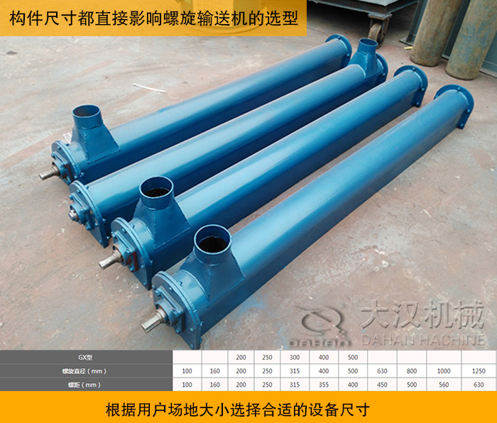 輸送機的構(gòu)件尺寸包括管道直徑大小(管式螺旋輸送機)或者槽體的寬度、深度,進料斗的尺寸大小等。這些構(gòu)件尺寸都直接影響螺旋輸送機的輸送能力。還要考慮用戶場地的空間還有安放的問題,根據(jù)用戶場地大小選擇合適的設備尺寸。