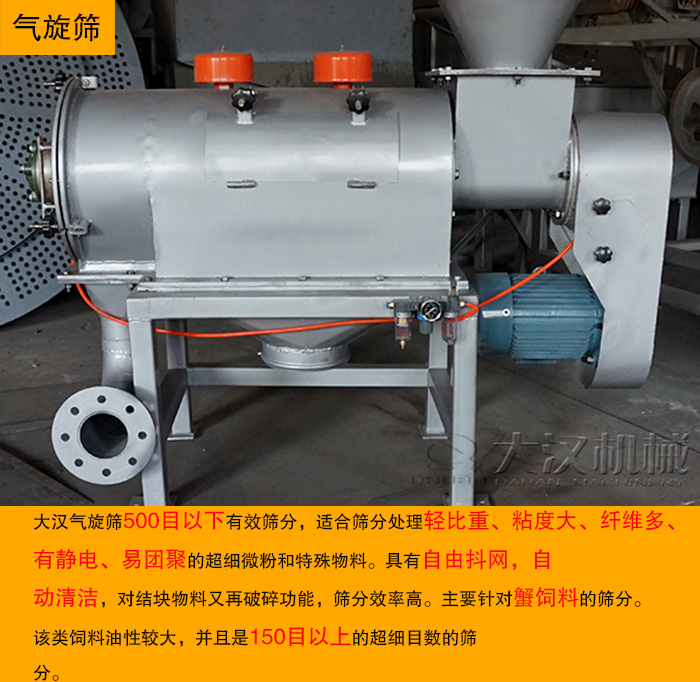 優(yōu)勢:大漢氣旋篩500目以下有效篩分,特別適合篩分處理輕比重、粘度大、纖維多、有靜電、易團(tuán)聚的超細(xì)微粉和特殊物料。具有自由抖網(wǎng),自動(dòng)清潔,對結(jié)塊物料又再破碎功能,篩分效率高。