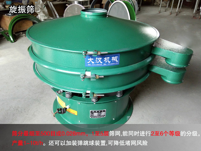 旋振篩作為一種高精度細粉篩分設備,篩分物料范圍廣,篩分細至500目或0.028mm,可篩1至5層篩網(wǎng),能同時進行2至6個等級的分級,一般情況下,不建議超過3層的設計,層數(shù)過多,影響篩分精度,產(chǎn)量1-10t/h。還可以加裝彈跳球裝置,可減少堵網(wǎng)現(xiàn)象的發(fā)生,增加篩分產(chǎn)量和篩分精度。