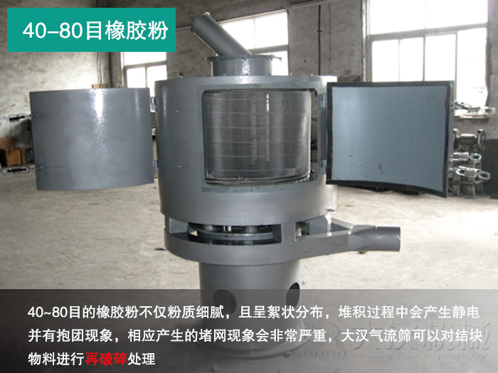 40~80目的橡膠粉不僅粉質細膩,且呈絮狀分布,堆積過程中會產(chǎn)生靜電并有抱團現(xiàn)象,相應產(chǎn)生的堵網(wǎng)現(xiàn)象會非常嚴重,不僅會嚴重影響篩分效率,還會產(chǎn)生混級現(xiàn)象和加速篩網(wǎng)磨損,因此我們建議使用氣流篩作為橡膠粉振動篩進行篩分。