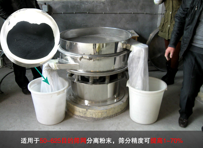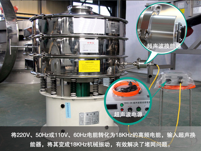 石墨粉比重較輕,粒度細在90到20微米以下,易抱團,流動性較好。普通振動篩在篩分過程中會出現(xiàn)物料團聚,漏料的情況,從而造成嚴重的堵網(wǎng)現(xiàn)象,而超聲波振動篩是將220V、50Hz或110V、60Hz電能轉化為18KHz的高頻電能,輸入超聲換能器,將其變成18KHz機械振動,使篩面上的石墨粉始終保持懸浮狀態(tài),有效解決了堵網(wǎng)問題。