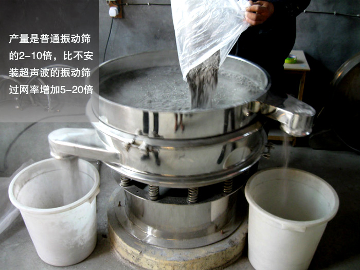 由于加裝超聲波篩分系統(tǒng)緣故,超聲波振動篩在篩分粉末、顆粒、漿液類物料時產量是普通振動篩的2-10倍,比不安裝超聲波的振動篩過網(wǎng)率增加5-20倍。
