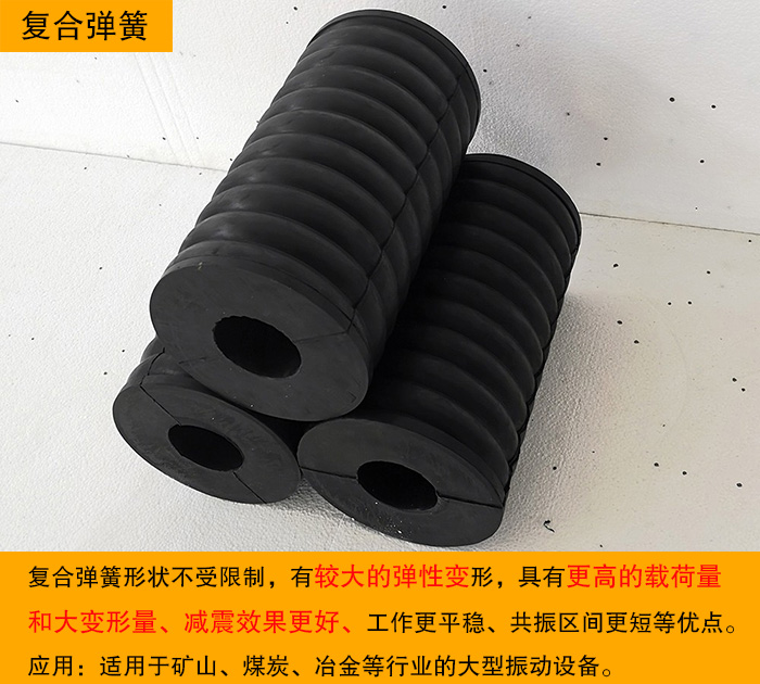 復(fù)合彈簧是由金屬螺旋彈簧和橡膠復(fù)合為一體的彈性體,集金屬?gòu)椈珊拖鹉z彈簧的優(yōu)點(diǎn)于一體,并克服兩者的缺點(diǎn),形狀和機(jī)械性能穩(wěn)定,能承受載荷和大變形量,具有隔振降噪效果好,工作平穩(wěn)共振區(qū)時(shí)間短等優(yōu)點(diǎn),尤其適用于礦山、冶金、煤炭等行業(yè)的大型振動(dòng)設(shè)備。