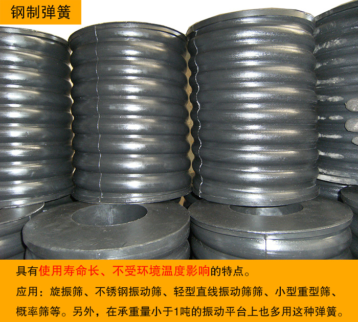 應(yīng)用:旋振篩、不銹鋼振動(dòng)篩、輕型直線振動(dòng)篩篩、小型重型篩、概率篩等。另外,在承重量小于1噸的振動(dòng)平臺(tái)上也多用這種彈簧。