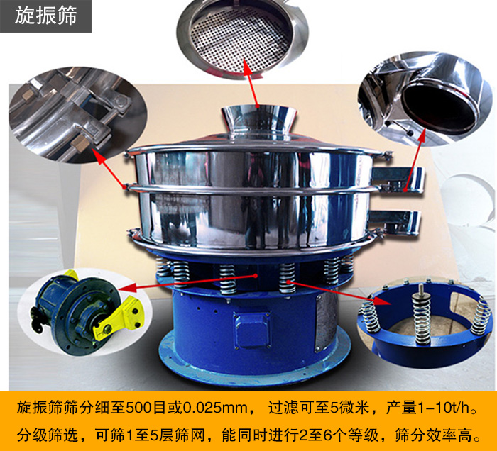 旋振篩可以篩選顆粒、粉末、粘液一定范圍內(nèi)均可篩選。篩分細(xì)至500目或0.025mm, 過濾可至5微米,產(chǎn)量1-10t/h。分級(jí)篩選,可篩1至5層篩網(wǎng),能同時(shí)進(jìn)行2至6個(gè)等級(jí),一般情況下,不建議超過3層的設(shè)計(jì),層數(shù)過多,影響篩分精度。