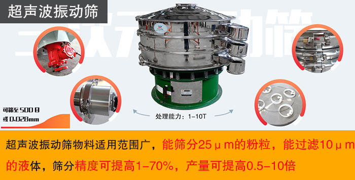 超聲波振動(dòng)篩物料適用范圍廣,能篩分25μm的粉粒,能過濾10μm的液體,篩分精度可提高1-70%,產(chǎn)量可提高0.5-10倍。