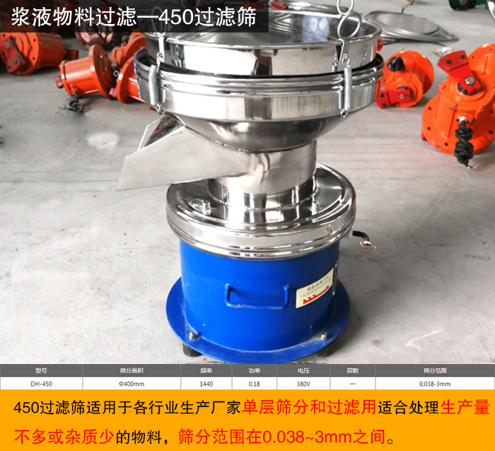 由于漿液粘稠度高,所以通常需要使用振動(dòng)篩進(jìn)行除雜過(guò)濾,那么漿液物料應(yīng)該選擇哪種振動(dòng)篩呢?一般情況下,當(dāng)篩分物料是液體時(shí),選用的450過(guò)濾篩或旋振篩。