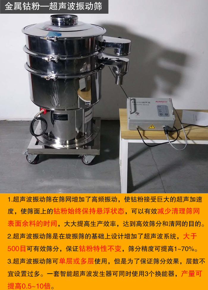 √不堵網(wǎng):在篩網(wǎng)增加了高頻振動,使鈷粉接受巨大的超聲加速度,使篩面上的鈷粉始終保持懸浮狀態(tài),可以有效減少清理篩網(wǎng)表面余料的時間,大大提高生產(chǎn)效率,達到高效篩分和清網(wǎng)的目的。
